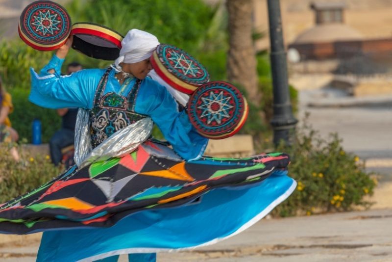 In addition to traditional belly dancing, most tickets to shows include other forms of dance, such as Tanoura. This spinning performance is a form of Egyptian folkloric dance performed by male dancers and accompanied by traditional music.
