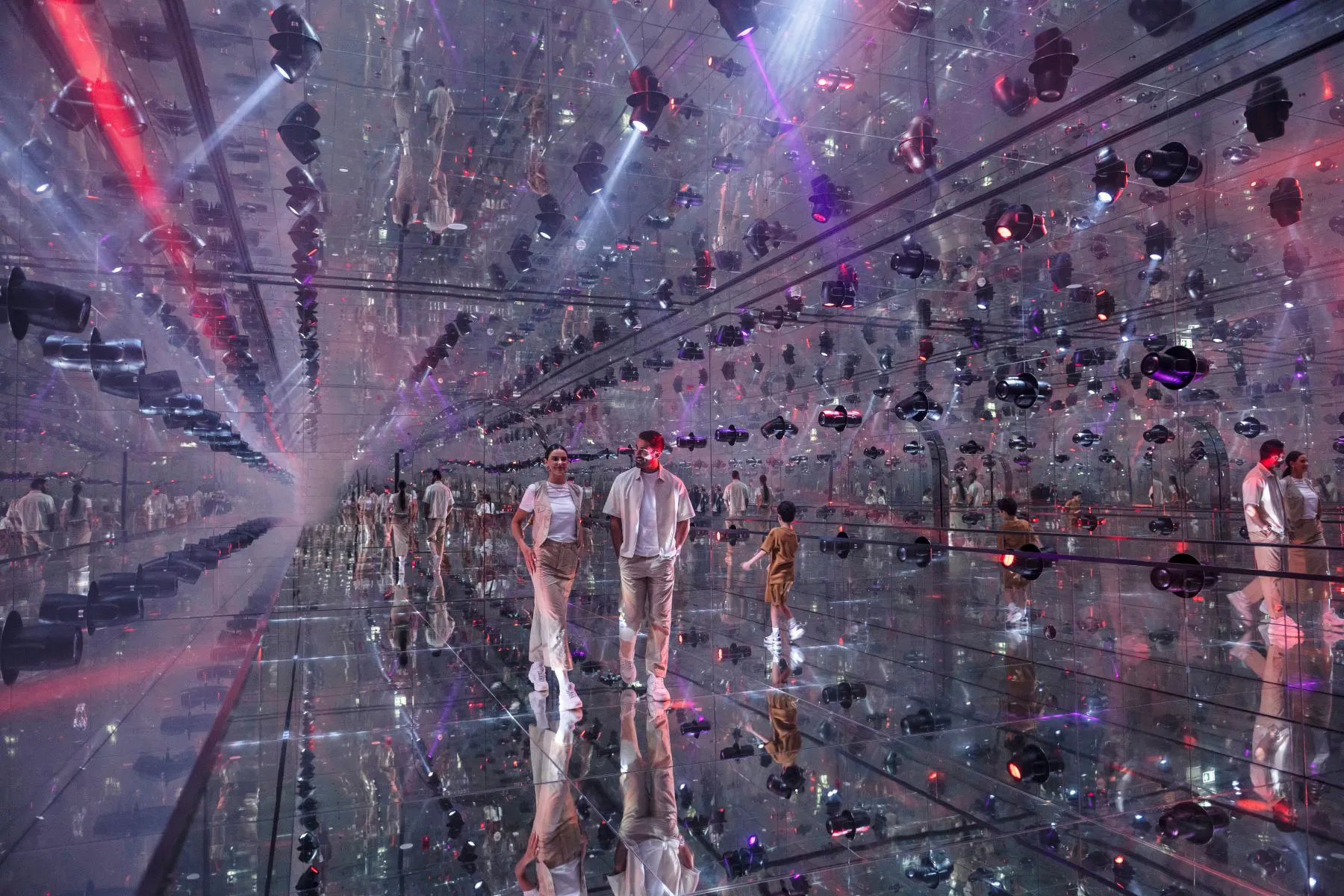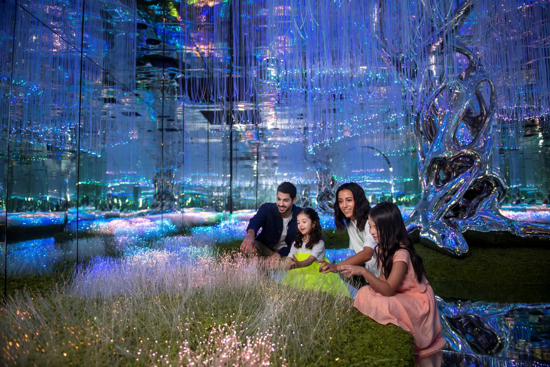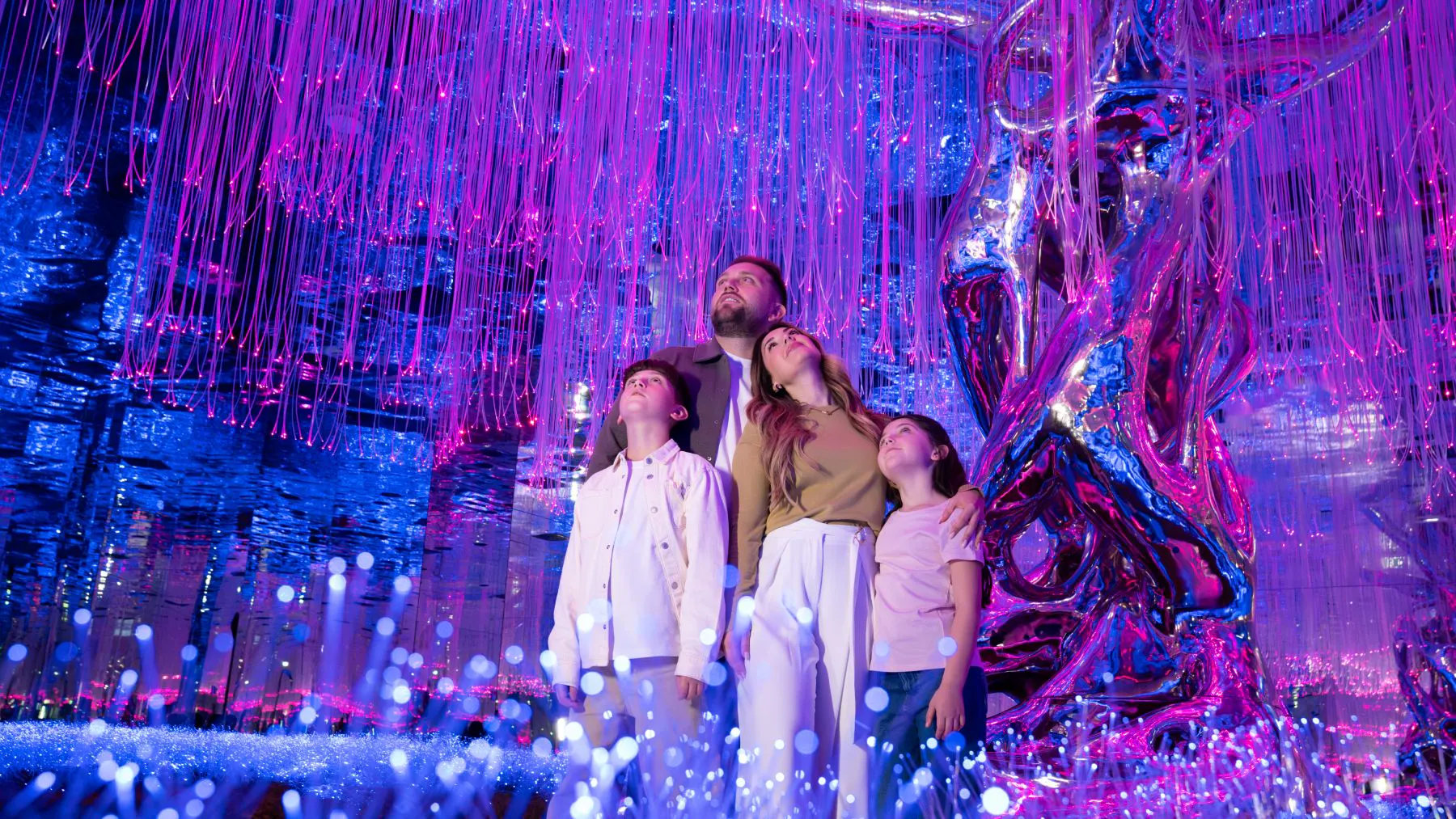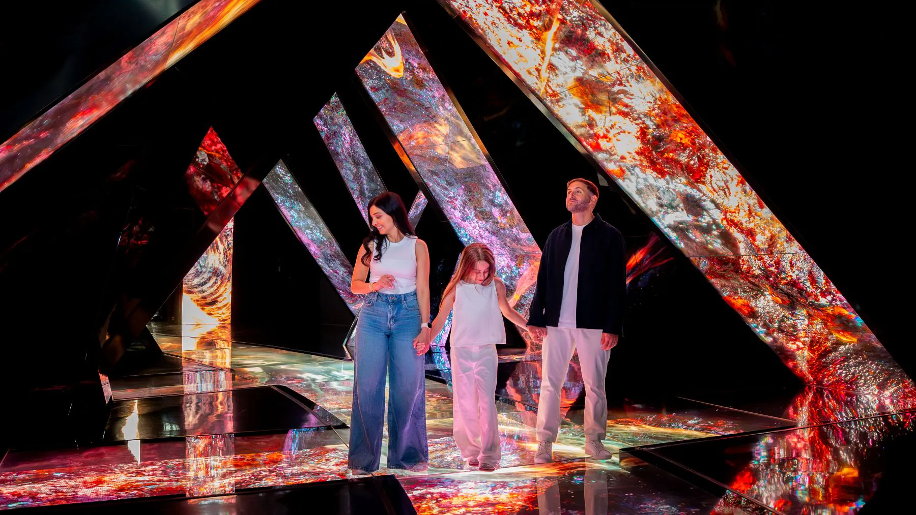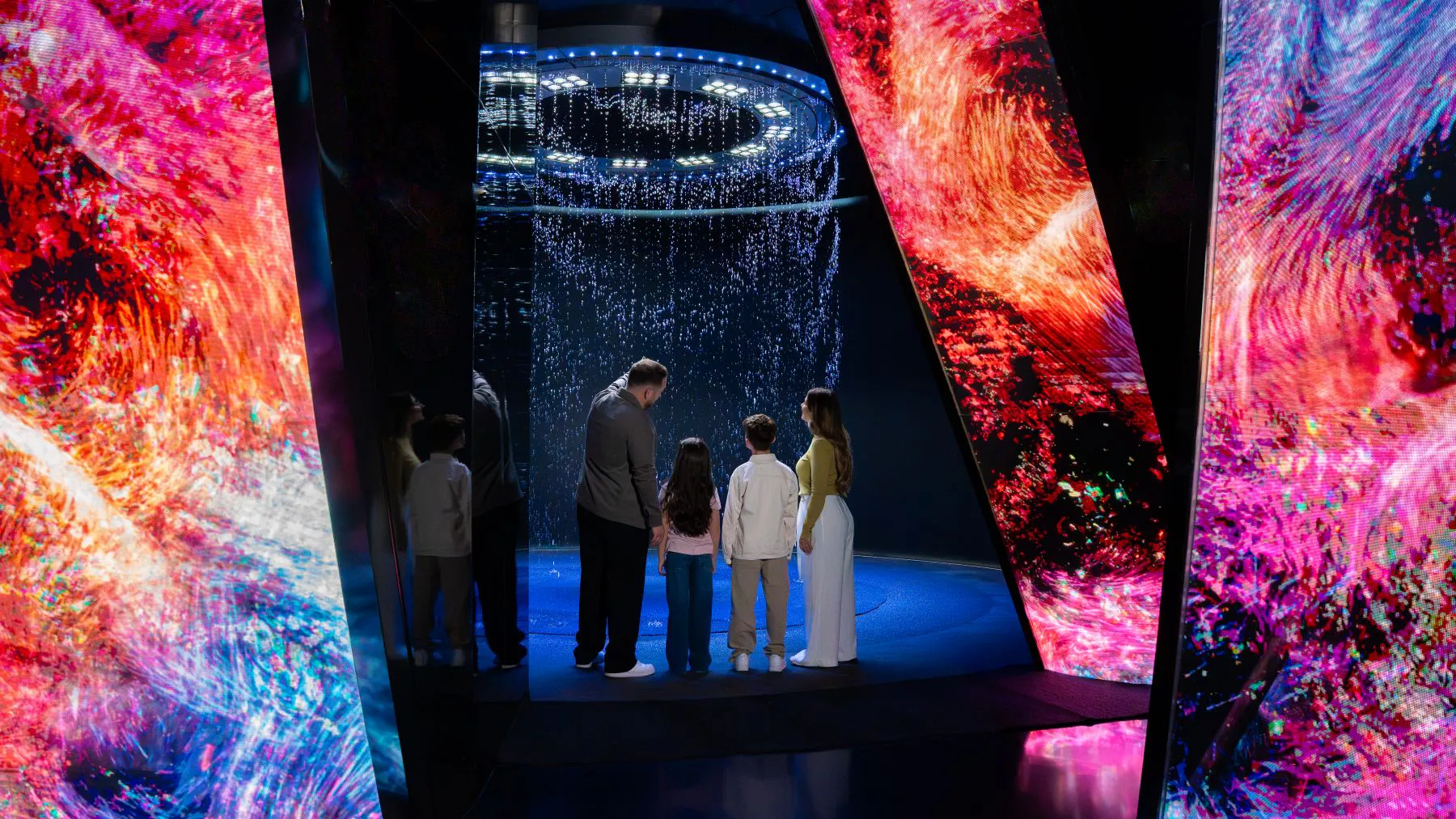 Explore the beautiful universe built with art, light, and technology. Visit AYA, an immersive experience in Dubai that takes you through 12 themed worlds. See features such as star fields, reverse waterfalls, gardens, and other visual displays.