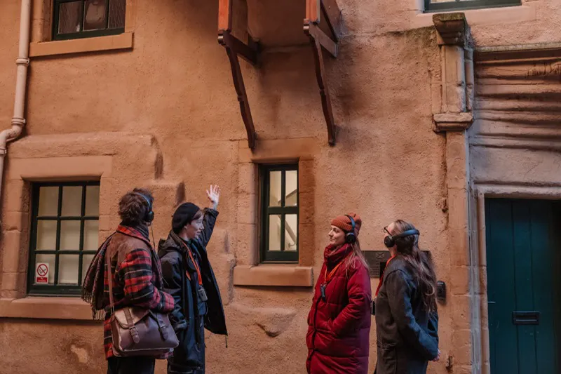 • Show your smartphone ticket to the guide at the starting point. The guides wear an orange name badge and a black cloak and stand at the Mercat Cross