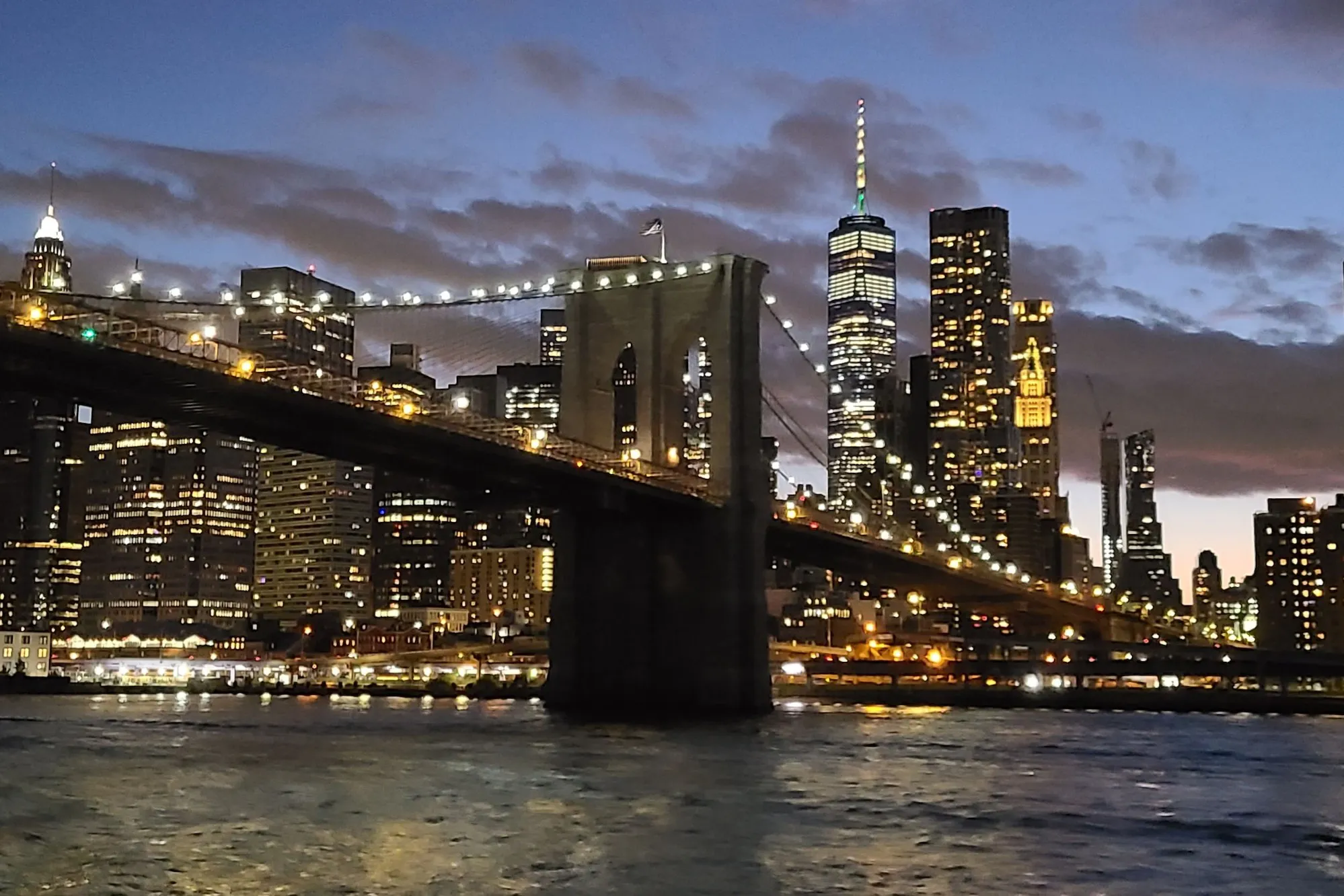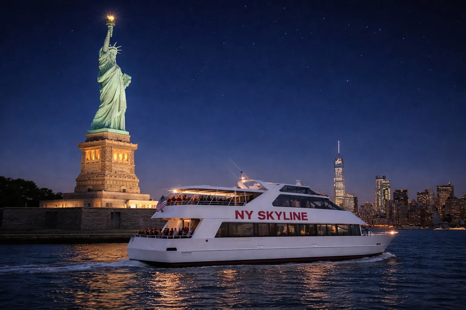 See the Statue of Liberty and One World Trade Center from the water. See the New York City skyline on an evening cruise around Lower Manhattan. The two-level boat features indoor and outdoor decks, a covered outdoor dance floor, and food available for purchase onboard.