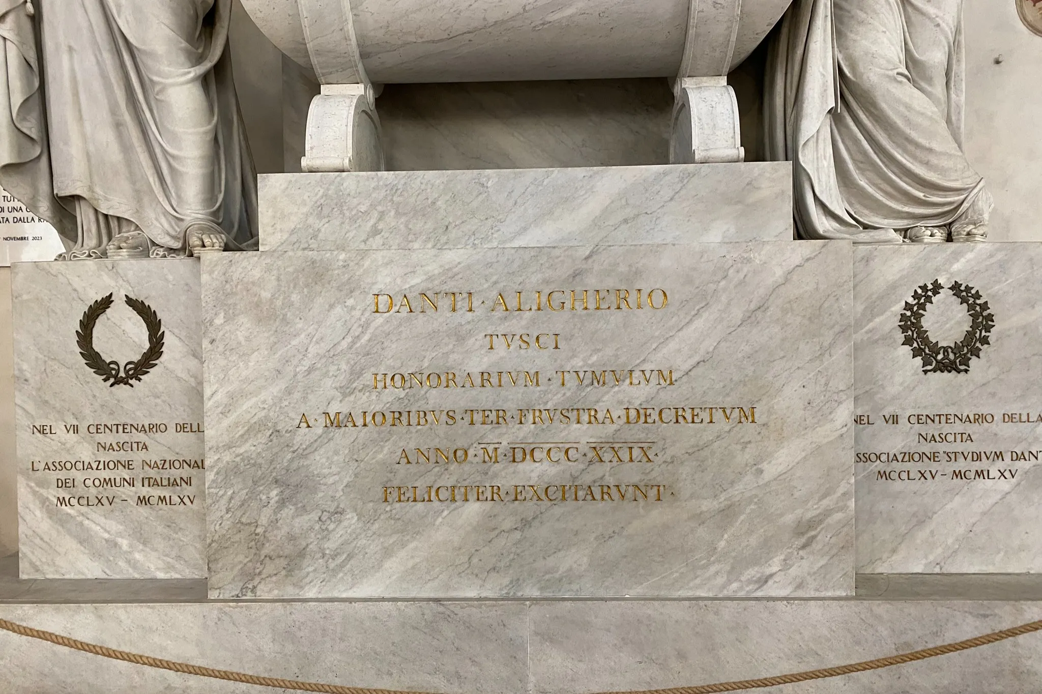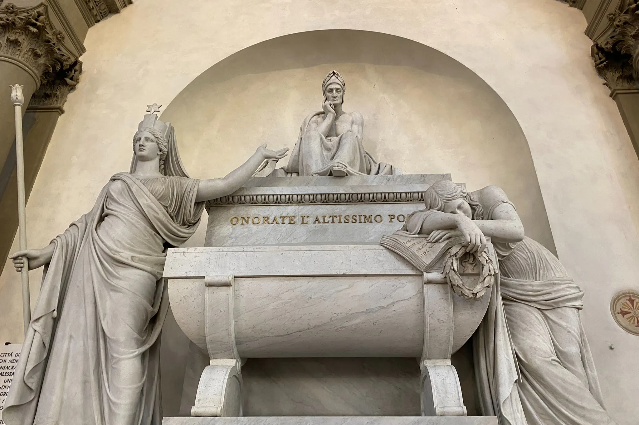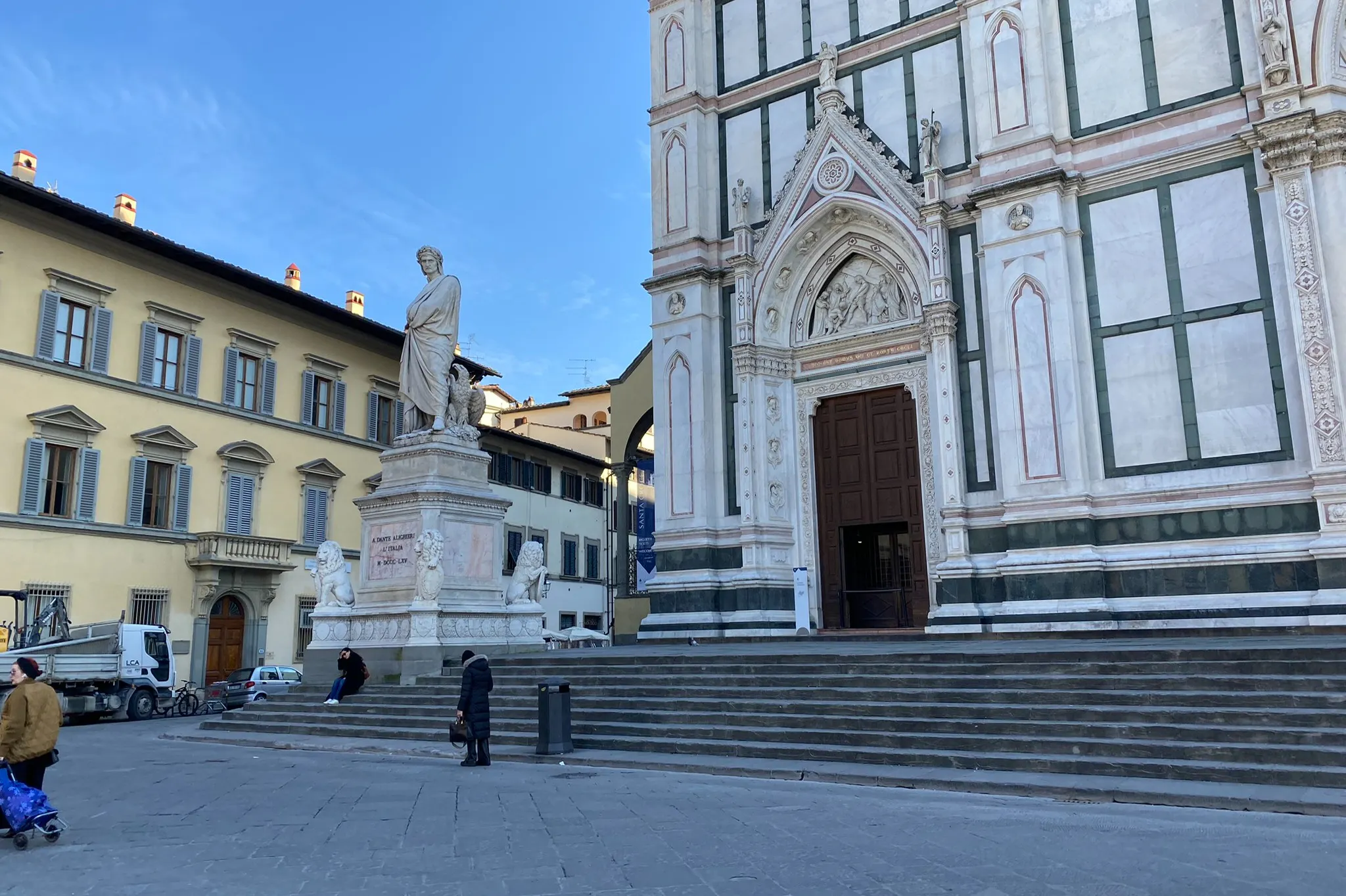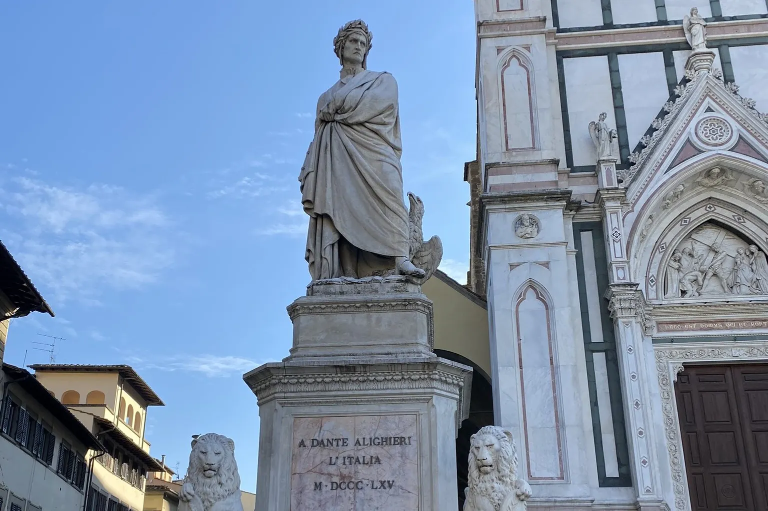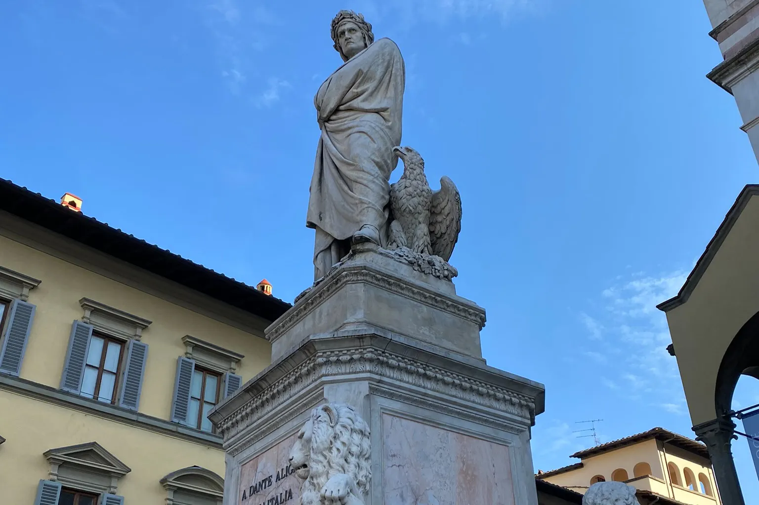 Alla statua di Dante Alighieri, saliti i gradini davanti alla Basilica di Santa Croce, Piazza Santa Croce, Firenze.