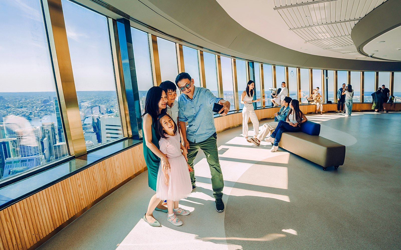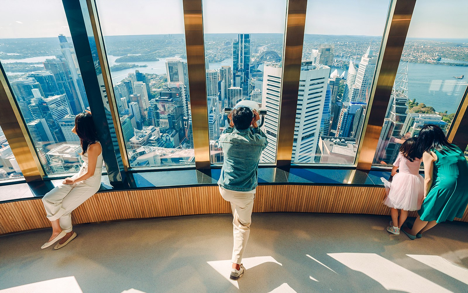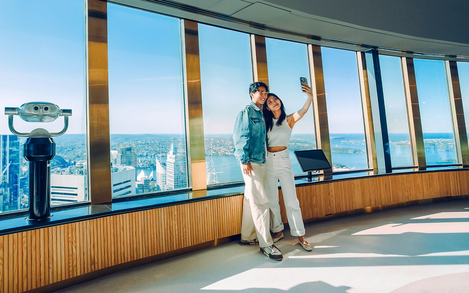 • Use free high-powered binoculars for a closer look, and explore interactive multilingual touchscreens that reveal stories behind Sydney’s most iconic landmarks, all in comfort, rain or shine.